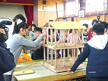 「世代をつなぐ防災・住まいの耐震授業」 平成26年11月11日 花巻市立新堀小学校にて 毎年恒例になりました、耐震授業。今回は花巻市立新堀小学校へおじゃましました。 授業はまず、地震による建物倒壊の被害の大きさを写真などで説明しました。その後、実際に重い梁材を持ち上げ重量を体感することで地震による倒壊の恐ろしさを改めて知ってもらいました。 次に、大きな住宅模型を揺らして、筋交いがない場合と、しっかり筋交いを入れて補強した場合との揺れの違いを体験してもらいました。さらに、小型の住宅模型を用いて、建物のどこに補強材を配置すればより強固なものになるか体験してもらいました。 このようにして、地震災害の予防策の一つである建物の耐震補強の重要性を理解してもらいました。また、身近でできる耐震として、家具固定を紹介し、子供たちにもすぐ実践できることを伝える事が出来ました。 |