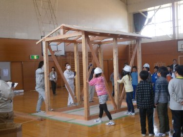 「世代をつなぐ防災・住まいの耐震授業」 平成26年11月11日 花巻市立新堀小学校にて 毎年恒例になりました、耐震授業。今回は花巻市立新堀小学校へおじゃましました。 授業はまず、地震による建物倒壊の被害の大きさを写真などで説明しました。その後、実際に重い梁材を持ち上げ重量を体感することで地震による倒壊の恐ろしさを改めて知ってもらいました。 次に、大きな住宅模型を揺らして、筋交いがない場合と、しっかり筋交いを入れて補強した場合との揺れの違いを体験してもらいました。さらに、小型の住宅模型を用いて、建物のどこに補強材を配置すればより強固なものになるか体験してもらいました。 このようにして、地震災害の予防策の一つである建物の耐震補強の重要性を理解してもらいました。また、身近でできる耐震として、家具固定を紹介し、子供たちにもすぐ実践できることを伝える事が出来ました。 |
